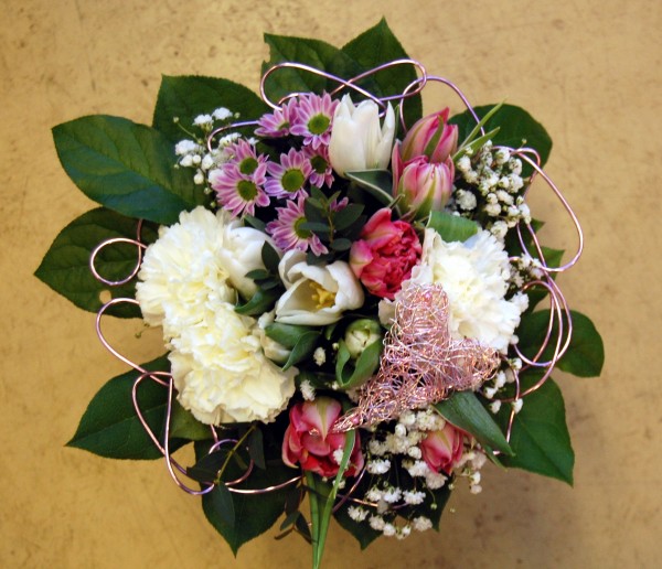 Buketten i vitt och rosa är bunden av klasskamraten Emelie.