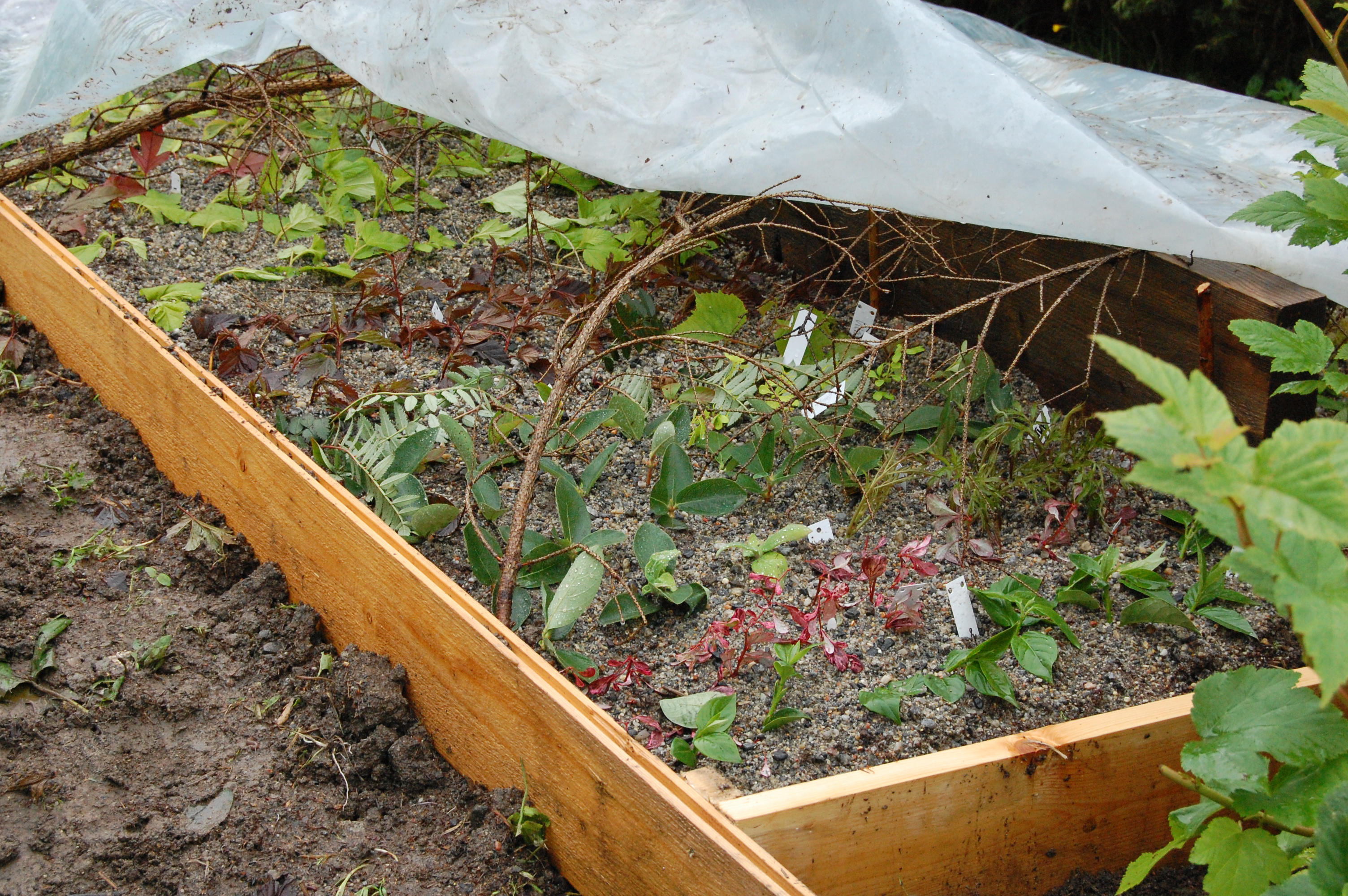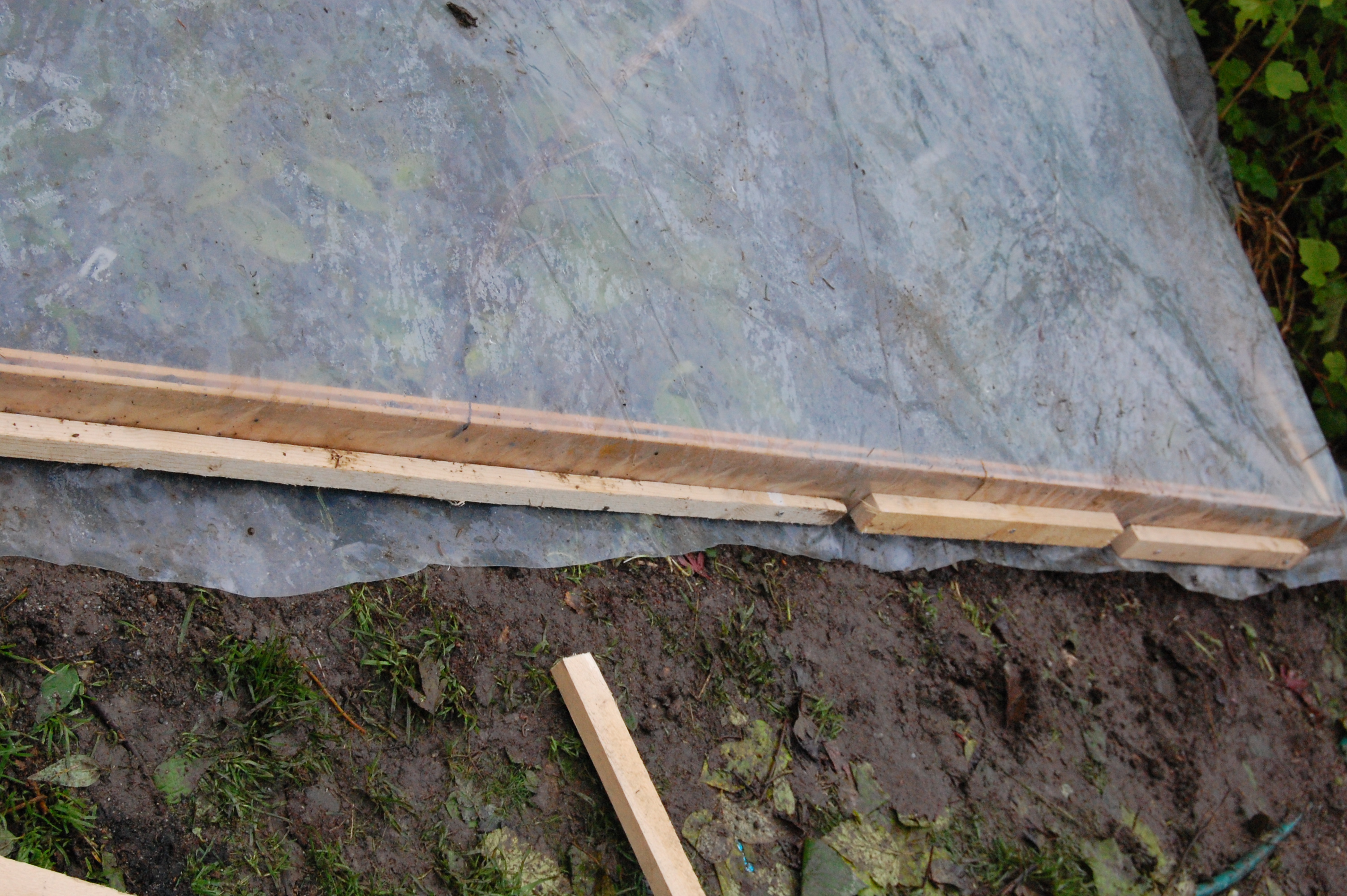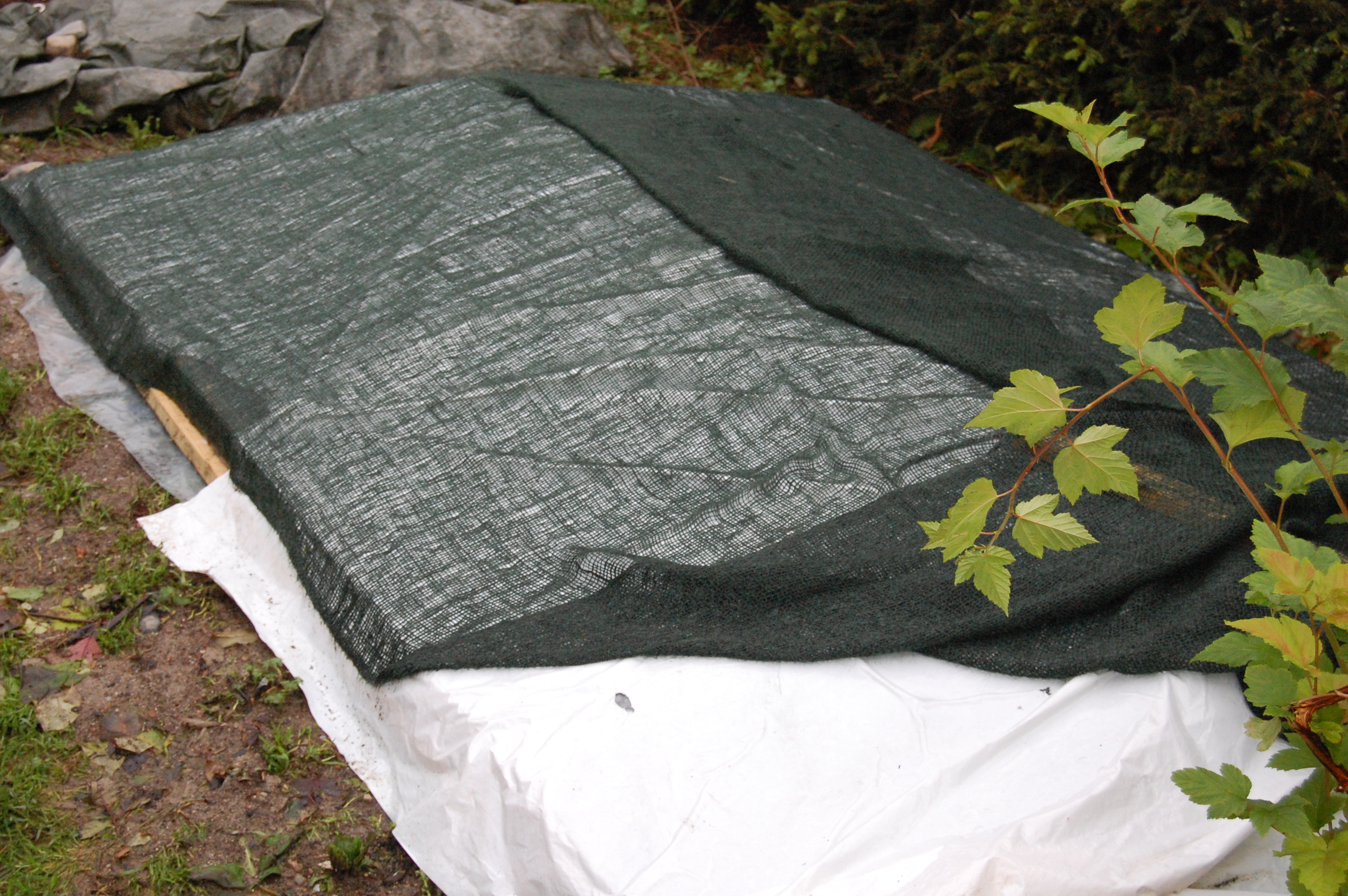 På ena långsidan av bänken stiftade jag fast en byggplast som dras över när allt är planterat klart. På motstående långsida fäster jag plasten med några ribbor som med några få skruvar fästs i bänkens ram. Efter några veckor öppnar jag för att plocka bort ev visset och kolla fuktnivån. Då går det bra att öppna genom att bara lossa några skruvar. På kortsidorna täcker jag plasten med stenar och skottar över lite jord. Plasten ska vara helt tät så att inte sticklingarna torkar ut. Vit plast är bäst, men inte lika lätt att få tag på, i så stor bit, men för att det inte ska bli drivhuseffekt under den genomskinliga plasten lägger jag över om jag har några småbitar vit plast och sedan en skuggväv.