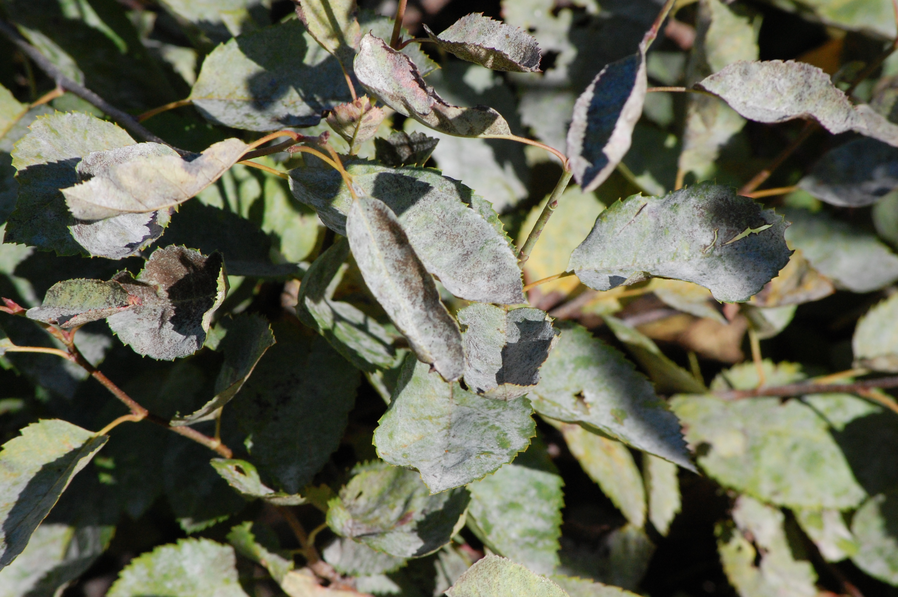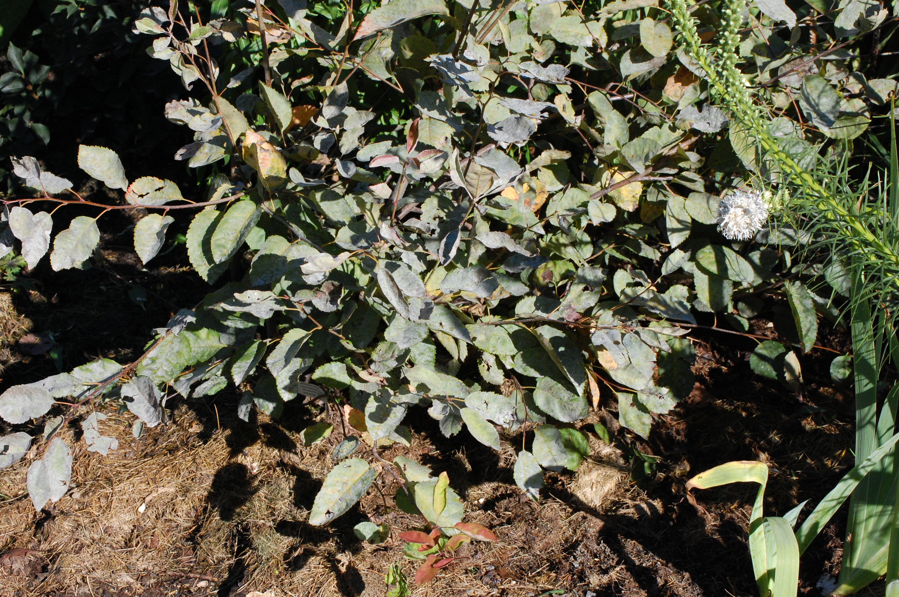En besökare på trädgårdsvisning berättade att de planterat en häggmispelhäck runt hela tomten. De hade köpt stora dyra plantor och nu hade hela häcken fått mjöldagg. De hade provat huskurer (HÄR finns recept) men det hjälpte inte så det blev till att köpa svampmedel. Kumulus som innehåller svavel går att använda, men måste precis som huskurerna upprepas under sommaren och även sprutas i förebyggande syfte. Vilket jobb att spruta hela häcken vartenda år! Och frågan är om det hjälper.