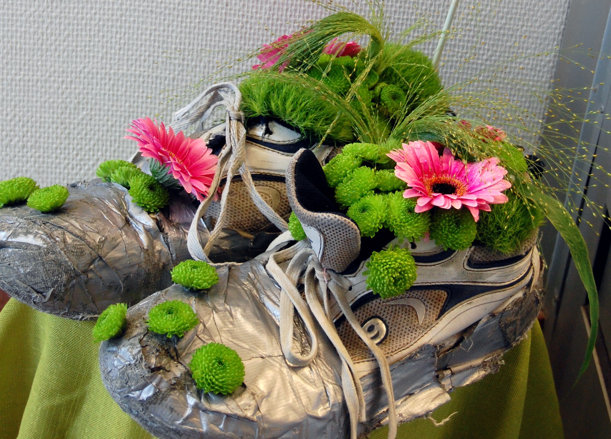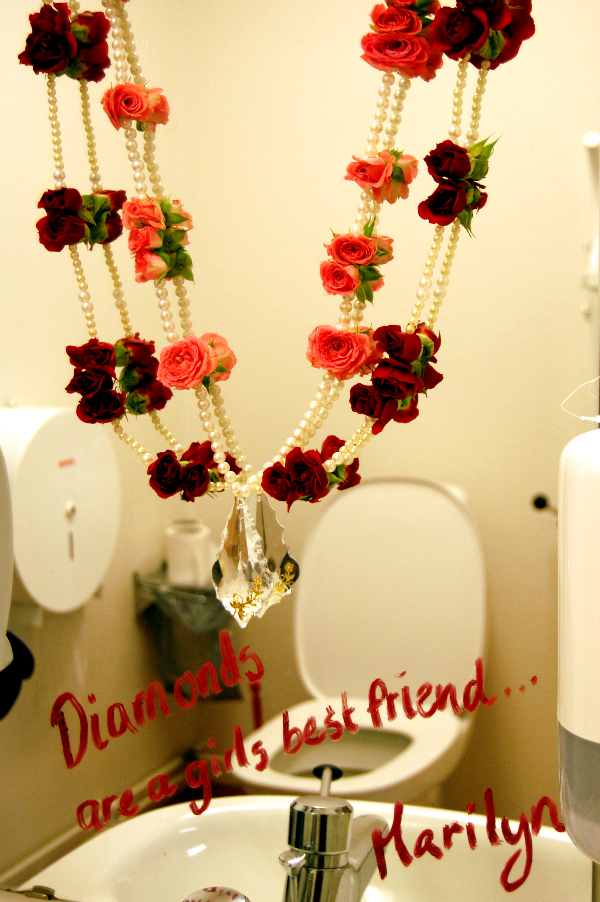 Inför sista dagen på floristutbildningen skulle vi välja två musikstycken/låtar och gestalta dem i blommor. Jag ante att det skulle bli fantastiska skapelser och det stämde. Allt gick att beskåda på Öppet Hus-dagen på Nordvikskolan. För dig som inte var där kommer här några bilder. Titta här på Marielles halsband som förgyllde toaspegeln!