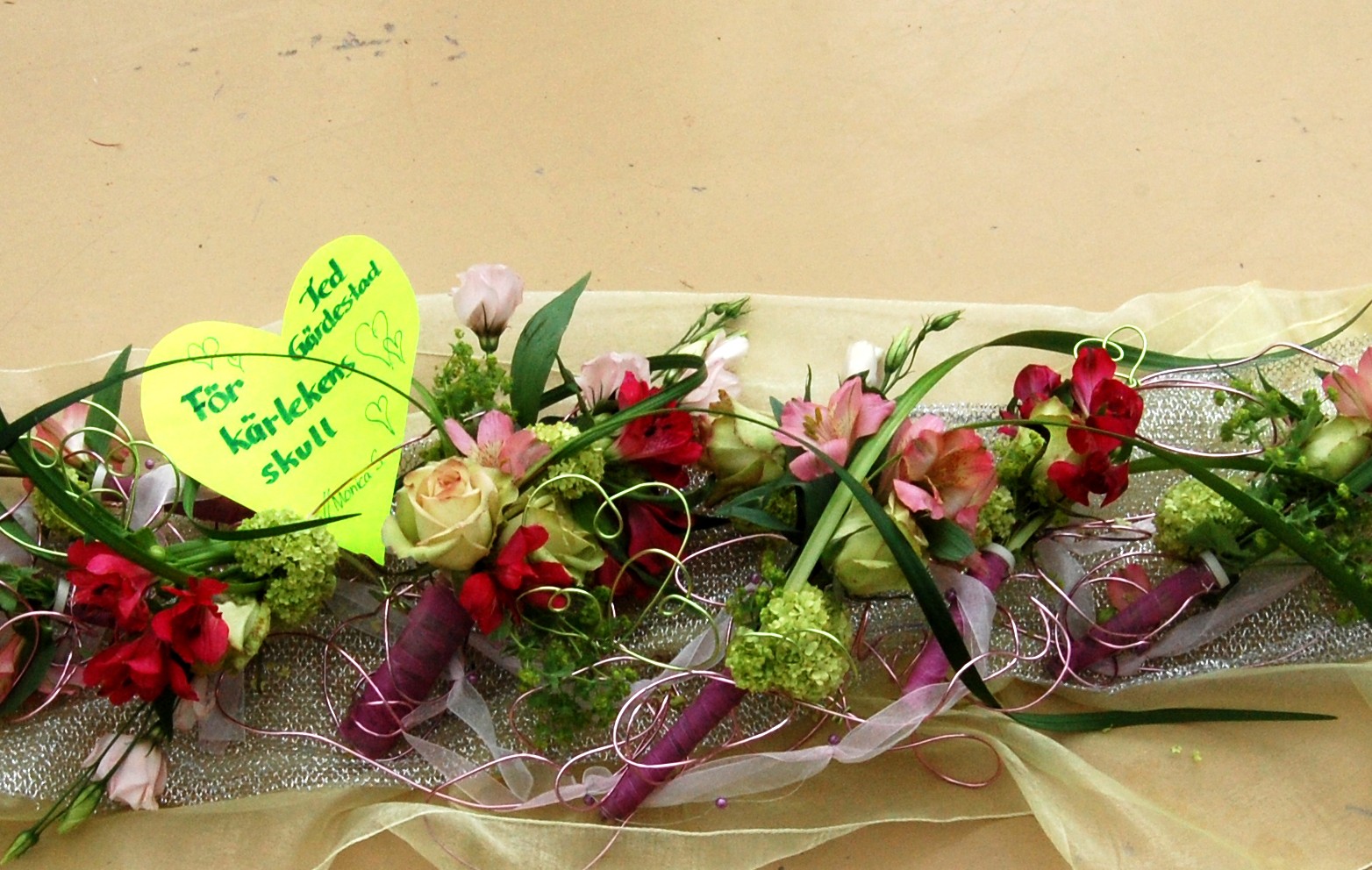 Jag gjorde en lång bordsdekoration för bröllop, med gabiontråden virad som hjärtan. Ted Gärdestads fina klassiker blev mitt tema.