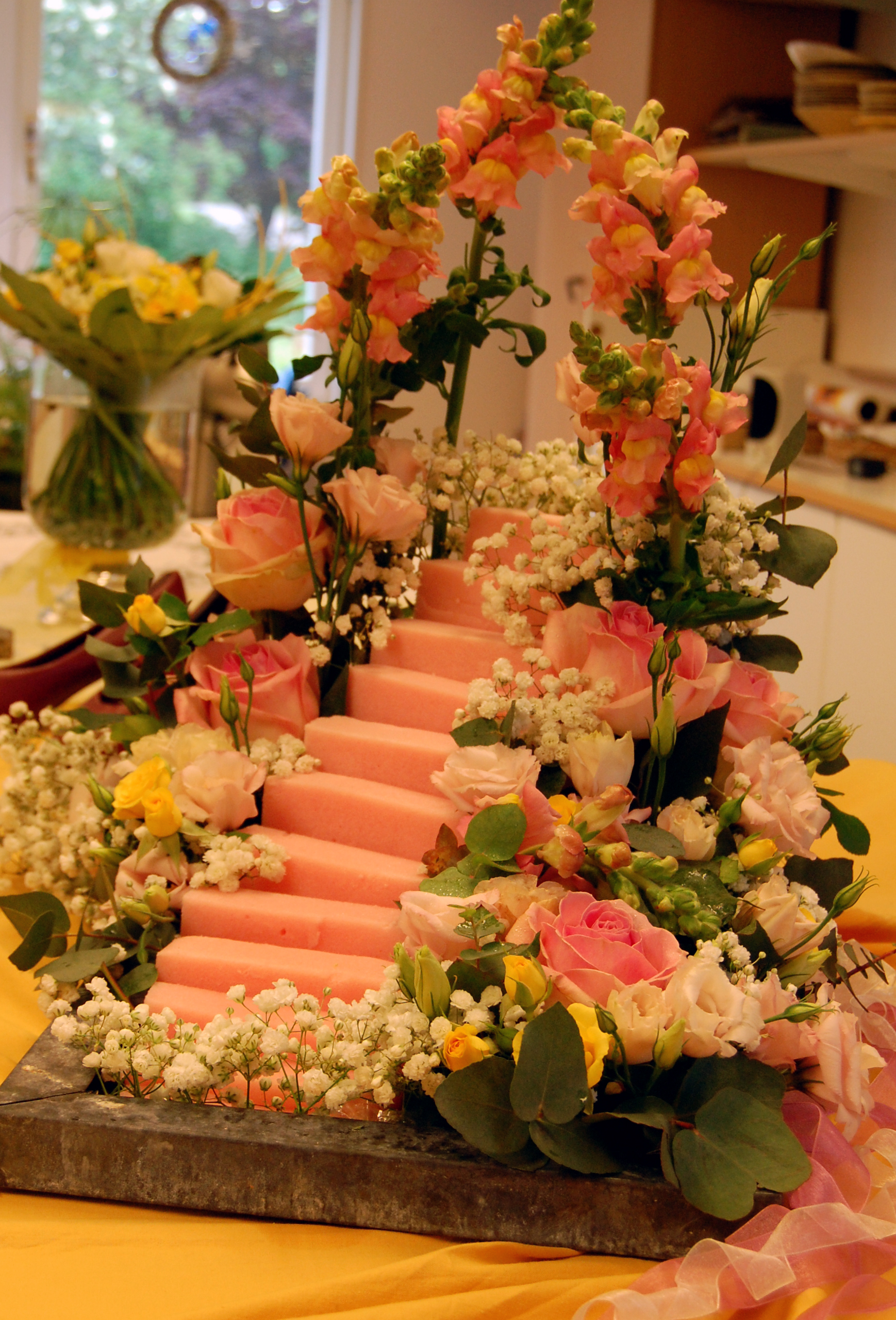 Emelies Stairway to Heaven är läcker som en marsipantårta. Den rosa trappan är faktiskt gjord av oasis som finns i fler färger än den vanliga gröna.