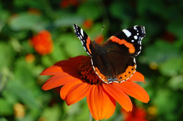Orange är långt ifrån min favoritfärg, men inkakragen, Tithonia rotundifolia, är jag lika förtjust i som fjärilarna är. Den liknar gerbera fast den har mindre blommor, men till snitt fungerar den lika bra. Tänk vilka färgsprakande buketter den ger!