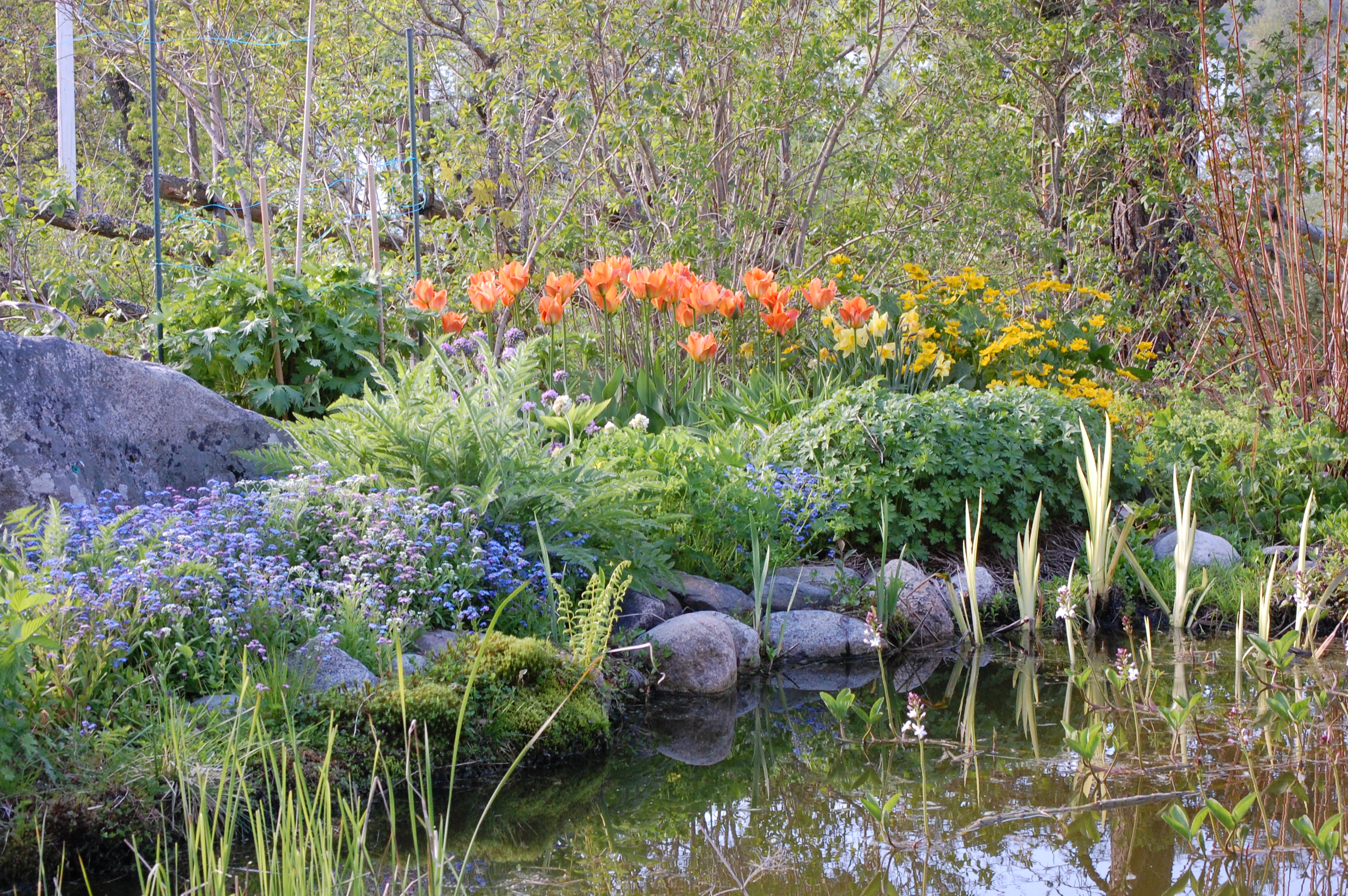 I år kom sommarvärmen så tidigt att vår- och försommarblomning flöt ihop. Trädgården ligger i norrläge, så en del tulpaner blommar fortfarande. För några veckor sedan såg det ut så här vid dammen.