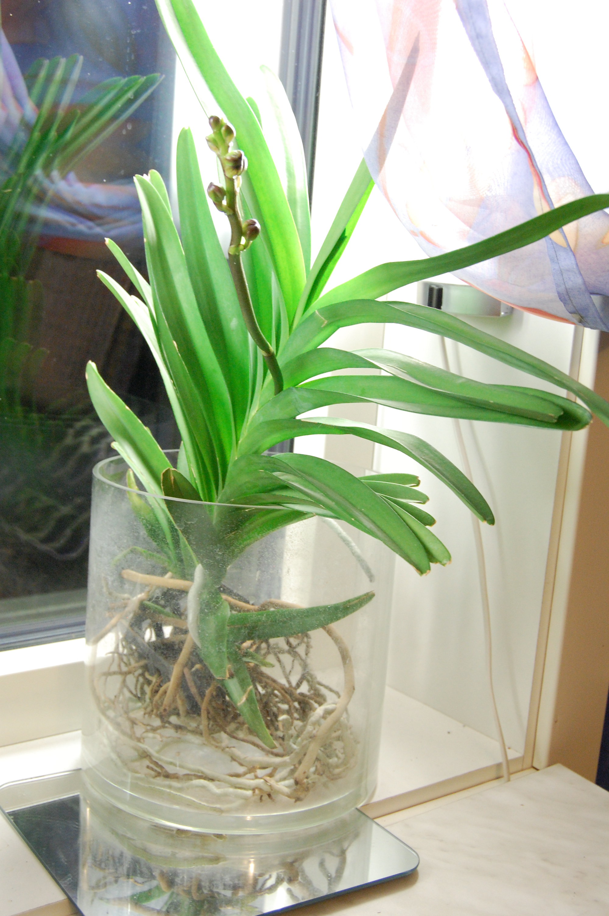 Jag hade hört att den var svårskött på det viset att man måste passa den varje dag med duschning då rötterna hänger fritt. Istället låter jag den stå med rötterna i ljummet vatten i 30 minuter varje vecka. Och duschar bara ibland. Den behöver mycket ljus så skålen får stå på spegelglas för att reflektera ljuset. Dessutom har jag monterat in lysrörsarmaturer som kompenserar det dåliga vinterljuset.